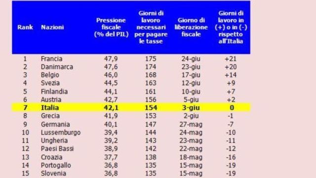 Il confronto con l'Europa. Se confrontiamo il “tax freedom day” italiano con quello dei nostri principali competitori economici, solo la Francia presenta un numero di giorni di lavoro necessari per pagare le tasse nettamente superiore (più 21, con un prelievo del 47,9%), mentre tutti gli altri hanno potuto festeggiare la liberazione fiscale con un netto anticipo. In Germania, ad esempio, 7 giorni prima di noi (40,1%), in Olanda 12 giorni (38,9%), nel Regno Unito 27 (34,8%) e in Spagna 28 (34,3%). Il paese più virtuoso è l’Irlanda; con una pressione fiscale del 23,6% che consente ai propri contribuenti di assolvere gli obblighi fiscali in soli 86 giorni lavorativi