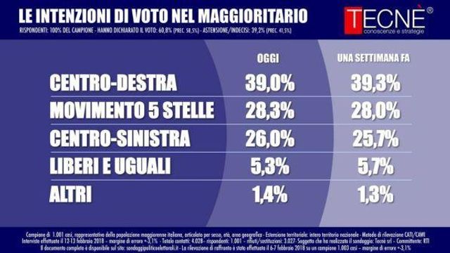 Centrodestra al 39%, M5s al 28,3% e Centrosinistra al 26%: sono i numeri dell'ultimo sondaggio di Tecnè sulle intenzioni di voto per le elezioni politiche del 4 marzo. Tra i singoli partiti si assiste a una lieve crescita del M5s (al 28% una settimana fa), stabile invece Forza Italia (al 18,3%), mentre arretrano leggermente Pd e Lega (rispettivamente al 21,8% e al 12,8%). Sono ancora 3,8 milioni però gli elettori indecisi.