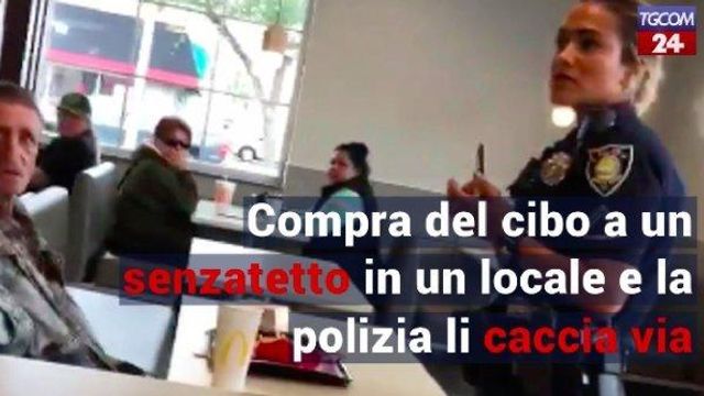 Un dipendente, però, non appena vede il senzatetto seduto al tavolo chiama la polizia affermando che il vagabondo prima avrebbe chiesto l'elemosina nel parcheggio. Sulla scena interviene una poliziotta che intima all'uomo di lasciare il cibo che sta mangiando e di andarsene dal McDonald's. Il cliente che ha offerto il pranzo, però, assiste alla scena e inizia a gridare la sua frustrazione: "Non mi ha nemmeno chiesto dei soldi! Fate schifo!". La sua reazione attira l'attenzione del manager del locale che chiede alla poliziotta di allontanare anche lui visto che stava disturbando gli altri.