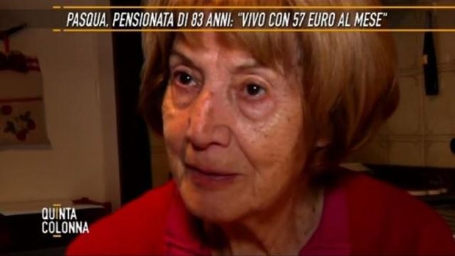 "Hai sempre la paura di non farcela, a volte ti vergogni anche, perché se devi chiedere un aiuto ci pensi non so quante volte". Inizia così l’intervista di Quinta Colonna a Pasqua Salomone, 83enne che vive con una pensione di 589 euro al mese. Sottraendo a questa cifra i soldi per bollette e affitto alla donna rimangono 57,41 euro: meno di 2 euro al giorno per poter mangiare e acquistare altri beni di prima necessità.