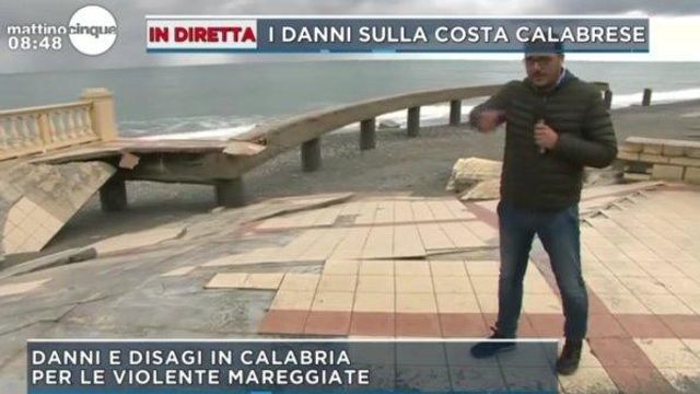 Il maltempo di primavera si è abbattuto su tutt’Italia con forti piogge, freddo polare e mare in tempesta. Tra le regioni più colpite c’è sicuramente la Calabria, dove sul versante tirrenico ci sono stati notevoli disagi proprio per via di una violenta mareggiata che ha colpito alcuni comuni del lametino. Soprattutto Gizzeria, Falerna e Nocera Tirinese. Proprio quest’ultimo comune è stato investito dalla forza del mare come ha modo di verificare l’inviato di Mattino Cinque, Guglielmo Mastroianni, che interviene in diretta da quanto ormai resta del lungomare di Nocera Tirense, completamente distrutto dalla forza delle onde. "Il lungomare è stato spazzato via dalla mareggiata, la pavimentazione ha ceduto completamente e quello che prima era un anfiteatro ora è completamente ricoperto dalla sabbia", racconta il giornalista.