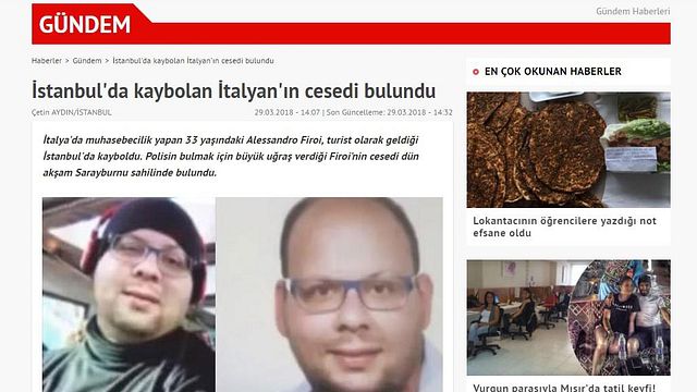 Il cadavere trovato dalla polizia turca, nei pressi della zona storica del palazzo di Topkapi, è stato portato sulla riva del quartiere di Sarayburnu dalla corrente del mare. L'uomo era partito per la Turchia il 12 marzo dall'aeroporto della Malpensa. Dal 14 marzo la famiglia non aveva avuto più notizie. Il padre che si trova a Istanbul ha chiesto il massimo riserbo sulla vicenda.