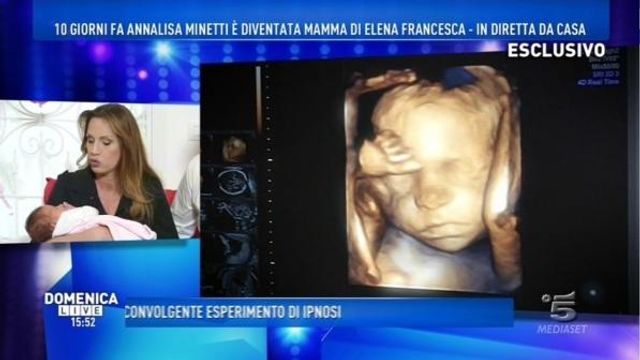 Le telecamere di Domenica Live hanno seguito passo dopo passo i giorni della nascita di Elena Francesca, dall'arrivo in ospedale della mamma prima del parto, alla nascita e al primo bagnetto della bimba. “E' stata un'emozione indescrivibile – ha raccontato la Minetti – ma non farò mai più il cesareo. Con lei ho instaurato un rapporto quasi animale, appena nata lei mi ha toccato le labbra come se avesse riconosciuto la mia voce”.