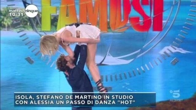 Incidente hot per Alessia Marcuzzi durante la finale dell'Isola dei Famosi. A provocare il gioco malizioso è stato Stefano De Martino ,che la lascia letteralmente in mutande. A Mattino Cinque il video esilarante. Mentre l’inviato del reality ripercorreva i suoi momenti più belli sull’Isola, all'improvviso su suggerimento della regia di Roberto Cenci parte la musica di Dirty Dancing. Stefano e Alessia si improvvisano ballerini, provano l'iconica presa del film, ma non hanno calcolato che a differenza della protagonista del film la Marcuzzi ha un vestitino molto corto che lascia poco spazio all'immaginazione. Stefano da grande ballerino esegue la presa, ma la Marcuzzi cerca di coprire il lato b ormai in mostra al pubblico in studio, che sembra apprezzare.