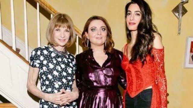 Protagonista della cover di maggio del mensile Vogue USA, Amal si ritaglia una serata mondana al Greenwich Village. Con un outfit anni 80, la moglie di George Clooney posa sorridente con Anna Wintour e Samantha Barry, direttrice della rivista Glamour. Ai piedi stivaletti neri con fibbia slanciano la sua silhouette invidiabile, ma è il bustier, rosso fuoco (in tinta con il rossetto), il pezzo forte del suo look. L'avvocato sorride e appare a suo agio anche senza il divo di Hollywood al suo fianco.