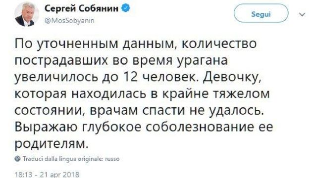 Una ragazza è morta e almeno 12 altre persone sono rimaste ferite a causa di una tempesta abbattutasi su Mosca. A darne notizia è stato il sindaco della capitale russa, Sergei Sobyanin, su Twitter, spiegando che "i medici non sono riusciti a salvare una ragazza che era in condizioni critiche".