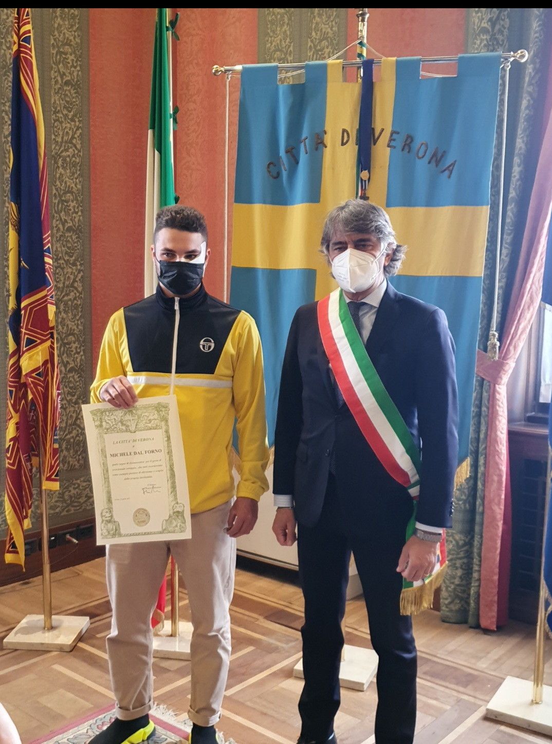 La medaglia della Città di Verona a Michele Dal Forno, il rider 21enne sfregiato sabato scorso con una coltellata al volto da un bullo 16enne, dopo essere intervenuto in difesa di una ragazza di 17 anni che discuteva animatamente con due coetanei. Gli è stata consegnata in municipio dal sindaco Federico Sboarina. Un'iniziativa per ringraziare il giovane del coraggio e del senso civico dimostrato: "per lo straordinario gesto che hai compiuto in difesa di una ragazza", è la motivazione.