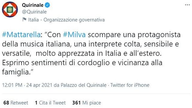 "Con Milva scompare una protagonista della musica italiana, un'interprete colta, sensibile e versatile, molto apprezzata in Italia e all'estero. Esprimo sentimenti di cordoglio e vicinanza alla famiglia". E' il ricordo della cantante da parte del presidente della Repubblica, Sergio Mattarella, pubblicato sul profilo Twitter del Quirinale.