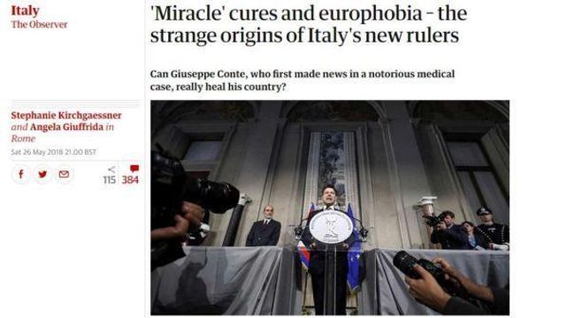 "Cure miracolose ed eurofobia: le strane origini dei nuovi governanti d'Italia": così, in un editoriale, The Guardian punta il dito contro il premier incaricato Giuseppe Conte e il ministro all'Economia in pectore Paolo Savona, ricordando l'esperienza di Conte a favore del Metodo Stamina e le posizioni anti euro di Savona. Per il quotidiano tedesco Fas a rischio i rapporti tra servizi segreti di Roma e Berlino.