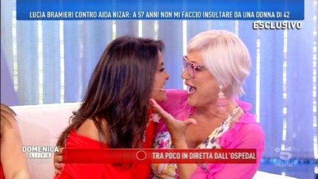 Uscite entrambe dal Grande Fratello prima della finale, avevano molto da dirsi. Dopo essersi a lungo punzecchiate, provocate e insultate nella casa più spiata d'Italia, le due gieffine Lucia Bramieri e Aida hanno fatto pace nel salotto di Domenica Live. Entrata in studio la giornalista spagnola ha iniziato il suo show sventolando un lungo abito rosso sulle note della colonna sonora de "Il Ciclone". Un ingresso che non passa inosservato così come la dichiarazione di pace tra lei e Lucia: le due, sedute vicine sul divano, si parlano e si guardano intensamente. Poi scatta il bacio a stampo tra le due. E ancora un bacio bis. Applausi a scena aperta per la pace fatta.