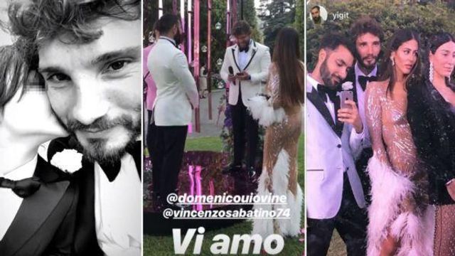 Location da sogno, panorama mozzafiato, vip a go-go, musica, balli sfrenati e tanto divertimento. Alle nozze di Vincenzo Sabatino e Domenico Iovine i protagonisti sono proprio Stefano De Martino, unico testimone della coppia insieme all'amica Giorgia Gabriele (ex di Gianluca Vacchi), e Gilda Ambrosio, unica damigella, incaricata di seminare petali di rosa lungo il cammino degli sposi.