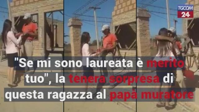 Judit Romero, giovane paraguayana neolaureata in Scienze dell'Educazione, ha voluto fare una tenera sorpresa a suo padre. Non appena terminata la discussione della tesi, infatti, ha deciso di raggiungerlo nel cantiere in cui lavora per consegnargli una copia del suo elaborato e ringraziarlo per averla aiutata a portare a termine gli studi. "Questo traguardo è anche merito tuo, di mamma e di tutta la famiglia - dice la ragazza con la voce tremante e le lacrime agli occhi, porgendo al genitore la tesi - è grazie a te e al tuo duro lavoro se ho potuto studiare e laurearmi". Un momento davvero commovente, che non poteva concludersi se non con un lungo abbraccio.
