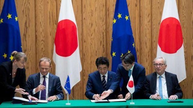 E' stato siglato a Tokyo l'accordo di libero scambio tra Unione europea e Giappone, con lo sottoscrizione di diverse intese politiche su una serie di temi regionali e multilaterali. A firmare il presidente della Commissione Ue Jean-Claude Juncker, il presidente del Consiglio europeo Donald Tusk, e il premier giapponese Shinzo Abe. L'intesa tra le due aree permetterà all'85% dei prodotti agroalimentari Ue di entrare in Giappone senza dazi.