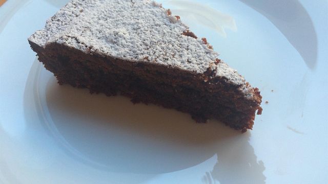 Montare il burro con lo zucchero fino ad ottenere la consistenza di una pasta, aggiungere uno alla volta i tuorli continuando a montare; unire la farina di mandorle ed il cioccolato sciolto a bagnomaria. Montare gli albumi a neve fermissima ed incorporare al composto mescolando dal basso verso l'alto per non farli smontare. Mettere in una tortiera imburrata e cuocere per 45 minuti a 180°. far raffreddare e servire cosparsa di zucchero a velo.