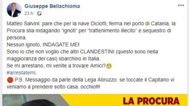 Il post "minaccioso" del deputato leghista - Sale alle stelle la tensione sulla vicenda dell'imbarcazione carica di migranti ancora ferma al porto di Catania, sulla quale il post in questione, firmato dal parlamentare del Carroccio Giuseppe Bellachioma, dice testualmente: "Matteo Salvini: pare che per la nave Diciotti, ferma nel porto di Catania, la Procura stia indagando “ignoti” per “trattenimento illecito” e sequestro di persona. Nessun ignoto, INDAGATE ME! Sono io che non voglio che altri CLANDESTINI (questo sono nella maggioranza dei casi) sbarchino in Italia. Se mi arrestano, mi venite a trovare Amici? #arrestatemi. P.S. Messaggio da parte della Lega Abruzzo: se toccate il Capitano vi veniamo a prendere sotto casa..occhio!!!".