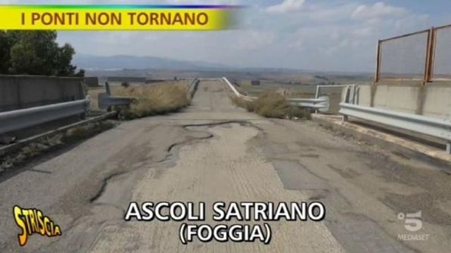 Ascoli Satriano è un piccolo comune situato nella provincia di Foggia che conta poco più di 6mila abitanti. Zona di raccolta di pomodori, è uno snodo di passaggio per tir e altri mezzi pesanti, ma le condizioni delle strade e soprattutto di alcuni ponti è ben oltre i limiti di sicurezza. Striscia la Notizia è andata a documentarne i problemi, parlando direttamente col sindaco, Vincenzo Sarcone: "Il problema maggiore riguarda il Ponte Romano, di proprietà della Provincia, che è stato chiuso e non viene restaurato. Ora rischia il crollo dopo duemila anni di storia". Ma non è l’unico: "Il cavalcavia dell'autostrada è chiuso al traffico dei mezzi pesanti – continua il primo cittadino – ma probabilmente viene utilizzato eludendo i controlli: una cosa gravissima". Nonostante la situazione però nessuno ha risposto agli appelli: "Non abbiamo avuto riscontri né dalla Provincia, né da Autostrade né dall'Anas".