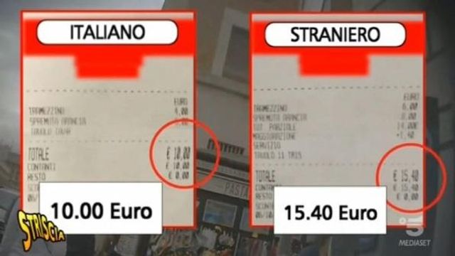 Un tramezzino e una spremuta in un bar nel centro di Roma non sempre hanno lo stesso prezzo. Infatti, "Striscia la Notizia" scopre che se sei un turista straniero paghi 15,40 euro, se sei italiano invece solo dieci. In alcuni locali la differenza aumenta ancora: 21,50 euro contro otto euro.