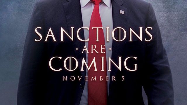 La "locandina" di Trump - Il presidente Usa ha pubblicato, senza altri commenti, un'immagine che lo mostra mentre cammina con un abito blu notte e una cravatta rossa, e la testa girata di lato. A sovrastare l'immagine la scritta "Sanctions are coming", riferimento appunto a "Winter is coming", titolo del primo episodio della serie televisiva. Le sanzioni arriveranno il 5 novembre, precisa la finta locandina. "Nessuna preoccupazione", fanno sapere dal ministero degli Esteri di Teheran