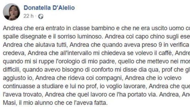 "Sorriso luminoso" - La sua insegnante ha voluto ricordare così l'ex alunno. "Andrea che era entrato in classe bambino e che ne era uscito uomo con le spalle disegnate e il sorriso luminoso - ha scritto su Facebook -. Andrea col capo chino sugli esercizi, Andrea che aiutava tutti, Andrea che quando aveva preso 9 in verifica non ci credeva, Andrea che all'intervallo mi chiedeva se volevo il caffè, Andrea che quando mi si ruppe l'orologio di mio padre, quello che mettevo nei momenti difficili, quando avevo bisogno di conforto mi disse dia qua, prof che glielo aggiusto io; Andrea che rideva coi compagni, Andrea che io volevo continuasse a studiare e lui no prof, io voglio lavorare, Andrea che quel lavoro l'aveva trovato, Andrea che quel lavoro ce l'ha portato via. Andrea, Andrea Masi, il mio alunno che ce l'aveva fatta".