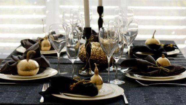 La tovaglia nera: davvero inconsueta, ma super glam: basta saper abbinare portafortuna e segnaposti in oro e piatti, anche molto semplici, ma possibilmente in una nuance color crema. Se non vogliamo rinunciare al rosso portafortuna, anche semplici piatti usa e getta accompagnati da bicchieri colorati e posate color oro vanno benissimo e restituiscono una tavola sontuosa e bellissima.