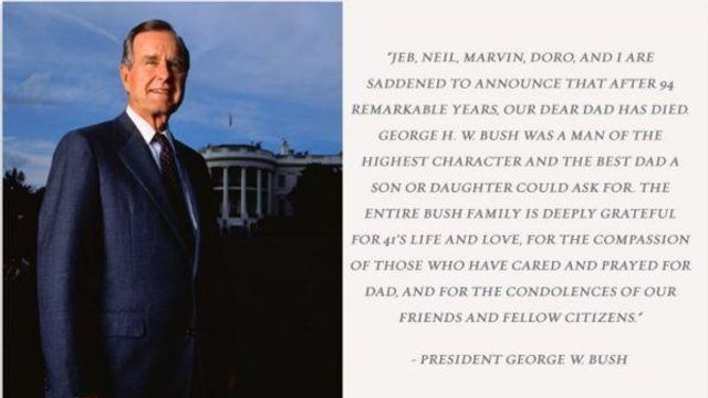 George Herbert Walker Bush, 41esimo presidente degli Stati Uniti, è morto all'età di 94 anni. Lo ha reso noto il figlio George Walker Bush, che fu presidente per due mandati. Bush senior, che da anni soffriva del morbo di Parkinson ed era costretto su di una sedia a rotelle, fu alla Casa Bianca dal 1989 al 1993 e si occupò principalmente di politica estera. In diverse occasioni aveva preso le distanze dall'attuale presidente Donald Trump.