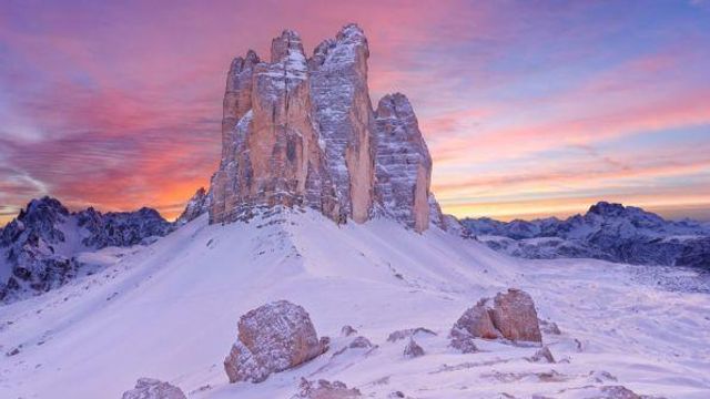 TRE CIME DI LAVAREDO – VAL DI SESTO - Sorgono al confine fra Trentino Alto Adige e Veneto e sono tra i picchi più famosi delle Alpi. Si trovano nelle Dolomiti di Sesto e sono considerate tra le meraviglie naturali più stupefacenti dell'arco alpino. Al tramonto assumono la classica colorazione rosata che ha reso celebri le Dolomiti in tutto il mondo.
