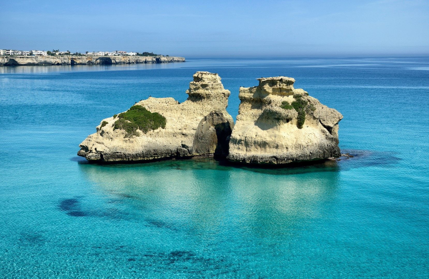 Spiagge selvagge - Scendendo verso sud, si incontrano le marine di Verone, lambite dall’Oasi naturale riserva delle Cesine. Qui le spiagge sono selvagge, solcate da striature di sabbia nera: sono le ceneri del vulcano Vulture che attraverso un gioco di correnti, si depositano sulla sabbia. Indimenticabili le marine di Melendugno: a Roca Vecchia, sito archeologico sul mare, si trova la piscina naturale che figura tra le dieci più belle al mondo: La Poesia (dal greco medioevale Posia che vuol dire sorgente di acqua dolce). Poco distante, scendendo a sud, si trova la baia di Torre dell’Orso, protetta da due alte falesie, all’ombra della torre di guardia del ‘500. La baia è famosa per lo scoglio a forma di muso dell’orso e per i faraglioni Le due sorelle. Impedibile una visita al faraglioni di Sant’Andrea: Lu Pepe con al centro un arco naturale e lo scoglio a forma d’Italia.