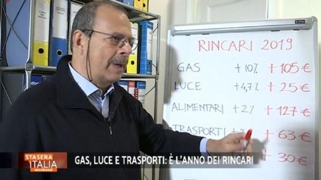 564 euro in più. Questa è la media delle spese che le famiglie italiane dovranno affrontare nel 2019. Un rincaro dovuto agli aumenti previsti su bollette, multe, cibo, assicurazioni e trasporti. L’unica voce che non aumenterà, almeno per i primi sei mesi del nuovo anno, saranno i pedaggi autostradali. Ma rimane comunque la stangata per tanti nuclei famigliari. Furio Truzzi di Assoutenti prova a spiegare quali saranno gli aumenti che andranno più ad incidere sul portafoglio: “Su fonte annua il gas aumenterà del 10%, la luce quasi del 5%, gli alimentari, i trasporti e la RC Auto del 2%”. “Stasera Italia” ha chiesto a Gianni e Tiziana, lui impiegato e lei commessa, come affronteranno i costi: “Sarà una bella botta: anche un aumento minimo delle spese di tutti i giorni incide molto sulle nostre tasche”.