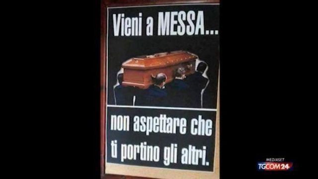 Vieni a messa, non aspettare che ti portino gli altri”. Questa la locandina apparsa sulla porta della chiesa parrochiale di San Giorgio al Tagliamento, paesino al confine tra Veneto e Friuli. L'invito è accompagnato dall’immagine, inequivocabile, di una bara portata a spalla da 4 persone. La trovata del parroco per attirare maggiori fedeli alla funzione non è passata inosservata e e secondo alcui fedeli la provocazione avrebbe un impatto emotivo troppo forte. C'è chi dice che il manifesto affisso "allontana le persone dalla chiesa", chi invece ritiene che "una bara come foto per andare a messa non ha senso".