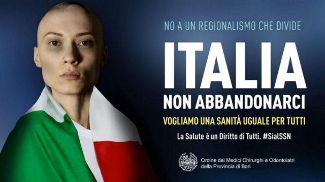 Una donna malata di tumore avvolta in una bandiera tricolore e una richiesta di aiuto: "Italia non abbandonarci. Vogliamo una Sanità uguale per tutti". E' l'immagine che appare sui manifesti della campagna promossa dal presidente della Federazione nazionale Ordini dei medici chirurghi e odontoiatri, Filippo Anelli, in risposta alle richieste di autonomia di Lombardia, Veneto ed Emilia. "Il rischio è di gravi ricadute sulla salute dei cittadini", spiega.