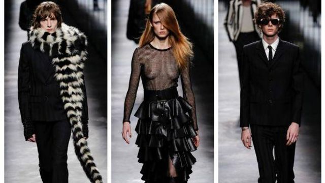 UNA PASSERELLA ‘CO-ED’ - La collezione maschile vede giacche mono e doppiopetto, giubbotti in pelle, righe bianche e nere, maglie in paillettes, cravatte strette, colli e sciarpe di folta pelliccia. Il tutto, mutuato e trasposto anche nel guardaroba femminile, che ha visto sfilare mini-dress e shorts, top trasparenti e camicie dalle profonde scollature, giacche ricamate e trench, cappelli da uomo. È il nero a fare la parte dominante ma prendono spazio anche l’oro e il rosso, l’animalier e bagliori sparkling.