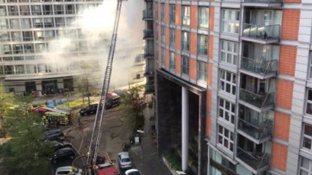 Sui social circolano diverse immagini dell'incendio, che ha prodotto una colonna di fumo visibile da varie parti della città. Le fiamme si sono sprigionate nella Torre D del New Providence Wharf Estate, un complesso di nuova costruzione che in totale conta diverse torri, 1.535 appartamenti e un hotel della catena Radisson Blu hotel, coinvolgendo parte dell'ottavo, del nono e del decimo piano.