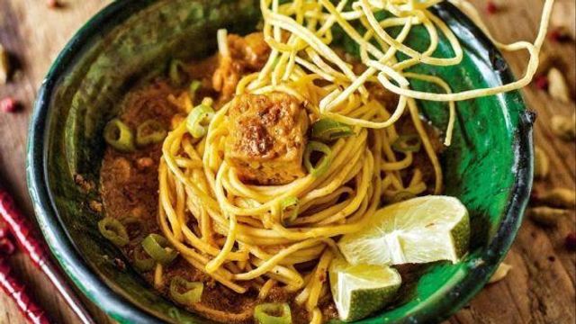 Per la zuppa: 200 g di tagliatelline all’uovo asiatiche; 500 ml di olio di semi di arachide; 2 lattine di latte di cocco (non agitarle prima dell’uso); 200 ml di brodo vegetale classico; 1 cucchiaio di salsa di soia; 2 cucchiai di zucchero di canna; 100 g di tempeh; 2 cucchiai di salsa di tamarindo; un pizzico di sale; 1 cipollotto; 1 lime