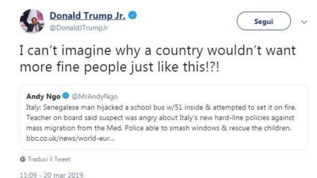 Sul sequestro dell'autobus pieno di ragazzini a Milano ad opera di un senegalese arriva l'ironia di Donald Trump junior, che scrive su Twitter: "Perché un Paese non dovrebbe volere più gente perbene come questa?". Subito dopo il commento, il figlio del presidente ritwitta il post di un giornalista americano che dà notizia del dirottamento.