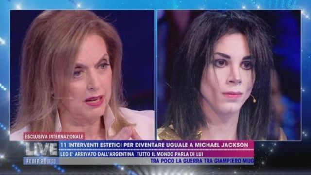 Ben undici interventi e altri due (almeno per il momento) in programma per somigliare al suo idolo Michael Jackson. E' la storia di Leo Blanco, che dall'Argentina è venuto in Italia per partecipare a "Live - Non è la d'Urso", dove si è confrontato con alcuni commentatori e opinionisti. "Il primo intervento che ho fatto è stato alle orecchie - spiega Leo Blanco durante la trasmissione di Canale 5 - Poi, col passare del tempo, ho fatto quattro operazioni al naso. Presto dovrò rifare il mento e la mascella". Gli ospiti di Barbara d'Urso si dividono, tra chi difende la sua scelta e chi invece non riesce a comprendere un comportamento simile.