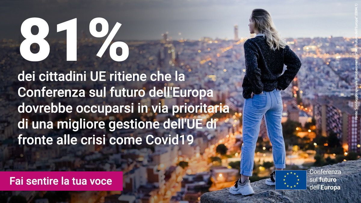 In vista del lancio della Conferenza sul futuro dell'Europa, il Parlamento europeo ha pubblicato i risultati dell'Eurobarometro sul futuro dell'Europa. Dopo una prima pubblicazione dei risultati il 9 marzo, il rapporto completo rileva che secondo otto europei su dieci (81%), una delle priorità della Conferenza dovrebbe essere una migliore gestione dell'Ue di fronte alle crisi come la pandemia di Covid. Più di un terzo (38%) si trova fortemente d'accordo con questa affermazione.