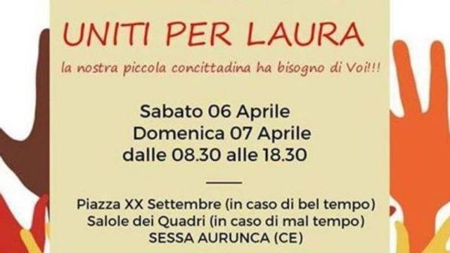 "Uniti per Laura, la nostra piccola concittadina ha bisogno di voi. Tutti insieme possiamo farcela", scrive Admo sulla pagina Facebook pubblicando le prime date per la ricerca di donatori compatibili: sabato 6 aprile, domenica 7 dalle 8.30 alle 18.30 a Sessa Aurunca, paese di origine della piccola. Le altre date in Campania: 7 aprile Cellole, 13 e 14 aprile Napoli piazza Dante, 21 aprile Cicciano.