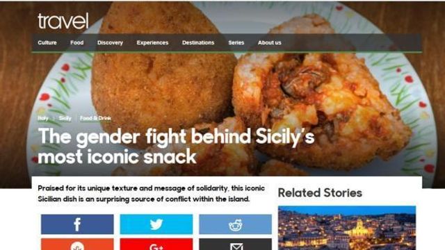 Con grande stupore del pubblico inglese, "questo iconico piatto siciliano è stato una fonte sorprendente di conflitto all'interno dell'isola". In maniera molto diligente, viene ricostruito il fenomeno per spiegare quella rivalità tra Catania e Palermo che oltre lo Stretto è palpabile nell'aria: "Uno dei più grandi motivi dietro la fama di questo cibo da strada - normalmente servito nei bar o nelle bancarelle di cibo sul marciapiede, semplicemente avvolto in un tovagliolo - è l'enorme dilemma di genere che si protrae da decenni. Mentre quelli che vivono sul lato orientale dell'isola usano il maschile arancino (arancini quando è plurale), i residenti del lato occidentale sostengono la forma femminile, arancina (arancine quando è plurale)".