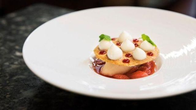 Un altro piatto molto richiesto al ristorante, che non esce mai dalla carta, è un sorbetto di acqua gassata con un’infusione di menta e buccia di limone, della panna montata, una sfoglia compressa e dei frutti dimenticati serviti tiepidi.