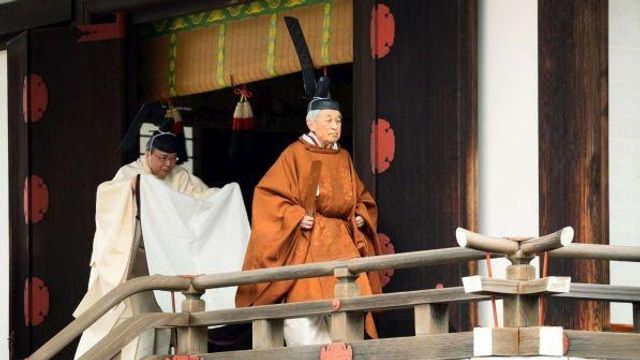 Vestito con abito e cappello tradizionale, con tanto di ciambellano al seguito, Akihito ha raggiunto uno dei templi del palazzo imperiale per annunciare alla dea del sole Amaterasu, mitica progenitrice della stirpe imperiale, che è pronto a rinunciare ai suoi privilegi. Poche immagini selezionate dall'Agenzia imperiale hanno immortalato il rituale, a cui ha partecipato anche il principe ereditario Naruhito.
