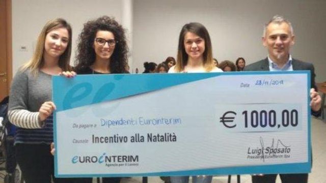 Un aumento del 30% delle nascite. E' questo l'effetto dell'iniziativa di un'agenzia per il lavoro di Padova, la Eurointerim Spa, che ha stanziato dei fondi per per favorire la natalità tra i propri dipendenti, circa 150 quelli operanti all'interno dell'azienda. Ad ogni dipendente della Eurointerim, sia fisso che controllato, è stata infatti riconosciuta una mensilità di stipendio in più alla nascita di un bambino.