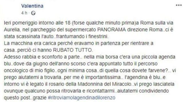 #ritroviamolagendinadilorenzo è l'hashtag che accompagna l'appello social di mamma Valentina. "Nella mia borsa c'era una piccola agenda blu - si legge ancora, - dove da giugno dell'anno scorso c'era appuntato tutto il percorso oncologico di mio figlio, ogni minima cosa... Di quella cosa dovete farvene? Vi prego aiutatemi a trovarla, per me è importantissima. L'agendina è blu e intorno vi è legato il rosario della Madonnina del Miracolo".