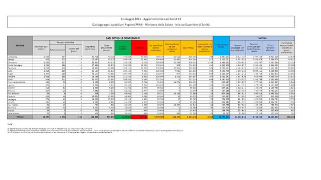 Sono 6.946 i nuovi casi di coronavirus registrati in Italia a fronte di 286.428 tamponi eseguiti. Il tasso di positività si attesta al 2,4%, in calo rispetto al 3,7% di lunedì. Nelle ultime 24 ore i decessi sono stati 251, per un totale di 123.282 dall'inizio della pandemia. I guariti odierni sono stati 16.503. Calano di 102 unità le terapie intensive, mentre sono 490 in meno i pazienti ricoverati negli altri reparti Covid.