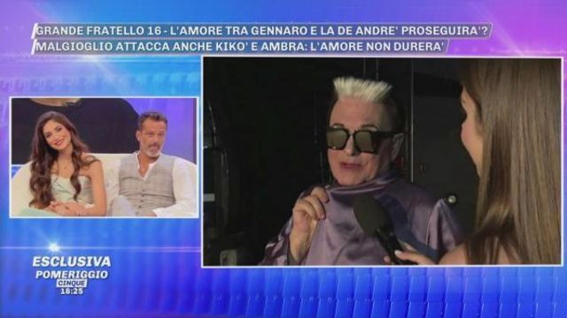 Cristiano Malgioglio è categorico: la storia tra Kikò Nalli e Ambra Lombardo "non durerà". "E' come uno di quegli amori estivi che iniziano il 15 agosto e terminano alla fine dell'estate", sostiene il cantautore in una clip mandata in onda a "Pomeriggio Cinque". Ma Nalli, ex gieffe e marito di Tina Cipollari, non ci sta e subito interviene per difendere l'amore con la sua nuova fiamma, Ambra Lombardo anche lei ex concorrente del "Grande Fratello 16".