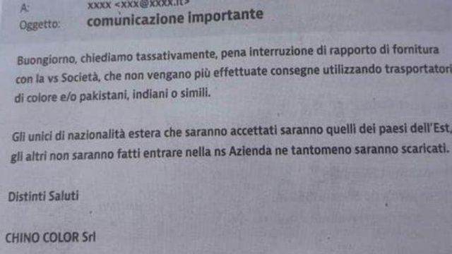 "Chiediamo tassitavamente che non vengano più effettuate consegne utilizzando trasportatori di colore e pakistani, indiani o simili". Questo è il messaggio che hanno ricevuto via mail alcuni fornitori della Chino Color, azienda di Lumezzane, nel Bresciano, specializzata nella lavorazione dei metalli. Nel testo viene specificato anche come gli unici fattorini stranieri che verranno accettati saranno quelli provenienti dall'Europa dell'est, "gli altri non saranno fatti entrare nella nostra azienda" specificano dalla Chino Color.