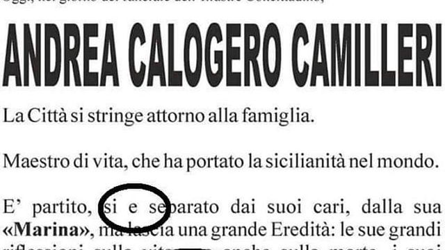 Omaggiare un cittadino come Andrea Camilleri non è un'impresa semplice ma a Porto Empedocle, città natale dello scrittore siciliano, la commemorazione è riuscita peggio del previsto. Nel manifesto funebre dedicato al padre di Montalbano, sono spuntati errori ortografici che avrebbero fatto rabbrividire qualunque maestro. Dalla "e" senza accento alla "sicilianità" trasformata in "sicinialità": in sole sei righe, ben tre gravi refusi e virgole alla rinfusa.