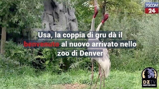 Sono grida di "gioia" quelle della coppia di gru per celebrare la nascita del loro cucciolo. E' successo allo zoo di Denver, quando i due uccelli hanno trovato il pulcino nel loro recinto.