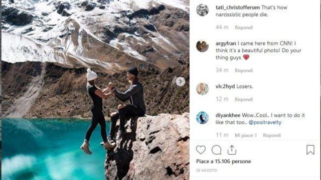 La didascalia - "C'è una differenza tra rischiare la vita e correre il rischio di averne una. Non lasciarti mai abbattere da chi ha troppa paura di vivere la propria”, hanno scritto i due blogger a spiegazione del post, sul loro accounte Positravelty il 28 agosto. La pioggia di commenti è iniziata subito dopo la pubblicazione. "Perché Kody ti fa sempre penzolare oltre il limite?", scrive qualcuno. “Questo post dovrebbe essere intitolato: "Selezione naturale al lavoro. Una scivolata e il gioco è fatto”, commenta un altro. Tuttavia, la foto ha ricevuto anche 14.000 like e tanti apprezzamenti. “Al diavolo gli haters: ama e vivi in grande!”, scrivono in tanti. Un dibattito che ha infiammato la rete.