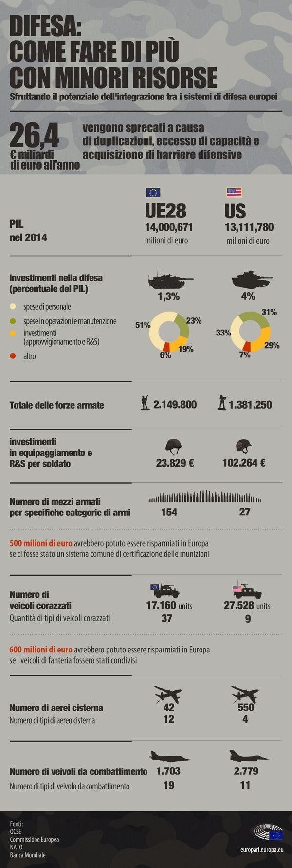 - 26,4 miliardi di euro: è la cifra sprecata ogni anno nelle spese militari a causa di duplicazioni, eccesso di capacità produttiva e ostacoli negli appalti;