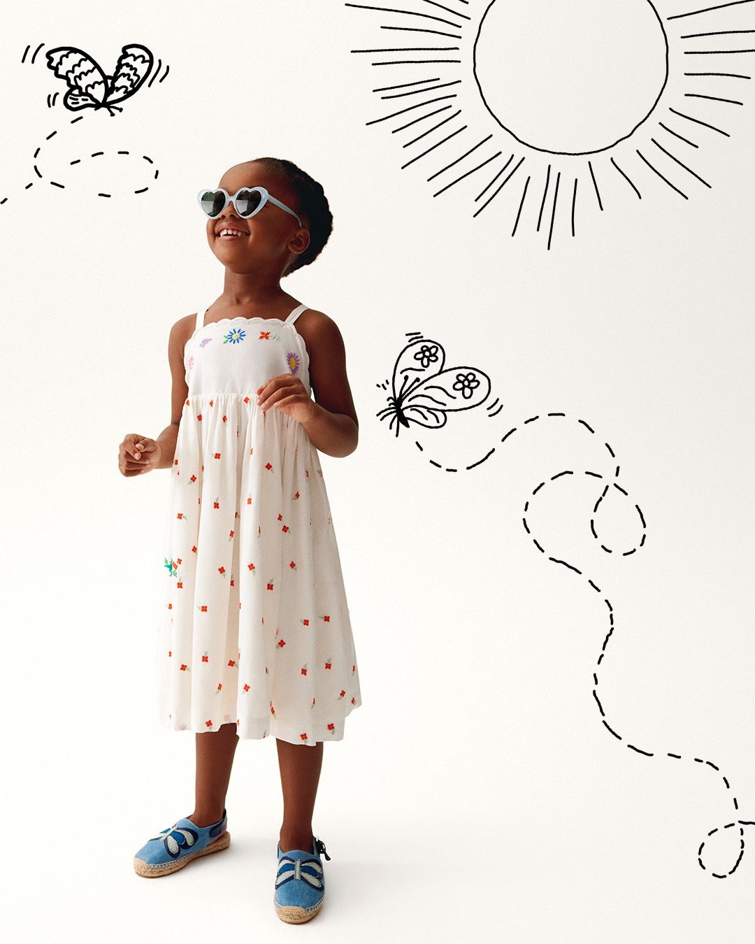 Un tempo da figli dei fiori per bambine e bambini fa evolvere l'evasione naturale della precedente collezione Primavera Estate 2021, che si arricchisce di fiori ricamati e grafici su giacche leggere e maglie, abiti bohemien e femminili, top con volant in una palette morbida di bianco classico e crema, insieme a grigi e rosa. Il denim elabora questa storia hippie attraverso pantaloni a campana, pantaloni a gamba larga e gonne e abiti arricciati in lavaggi più chiari.